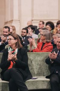 Marguerite Longuet-Dassault a conclu la séquence des discours au nom de la Fondation MAD. Avocate de profession, elle a évoqué son attachement aux enjeux sociaux liés à l’écriture et posé la question d’un droit à la maitrise de l’écriture. Engagée depuis plusieurs années aux côtés de la Fondation pour l’écriture, elle a détaillé certains des projets qui ont retenu son attention, notamment les actions en lien avec des jeunes sous-main de justice ou en services hospitaliers.