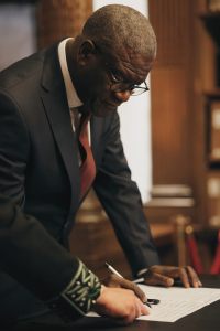 Le docteur Denis Mukwege a été élu au fauteuil 1 des membres associés étrangers le lundi 23 septembre 2024. Son élection a été approuvée par le président de la République, protecteur de l’Académie, par un décret en date du 25 novembre 2024, publié au Journal Officiel. À ce fauteuil, Denis Mukwege, dont l’action et le parcours exceptionnels en République Démocratique du Congo auprès des femmes victimes d’exactions sexuelles, ont été couronnés en 2018 par le prix Nobel de la Paix, succède à Javier Pérez de Cuéllar, lui-même élu membre associé étranger le 23 janvier 1989 au fauteuil laissé vacant par le décès de Constantin Tsatsos. Le président rappelle qu’à ce fauteuil ont siégé d’autres figures illustres, également prix Nobel pour certains d’entre eux, notamment Theodore Roosevelt, 26ème président des États-Unis (1901-1909), élu associé étranger en 1909, prix Nobel de la paix en 1906, grâce à son rôle de médiateur dans la guerre russo-japonaise, mais aussi Maurice Maeterlinck, écrivain flamand francophone, élu à l’Académie en 1937, prix Nobel de littérature en 1911.
