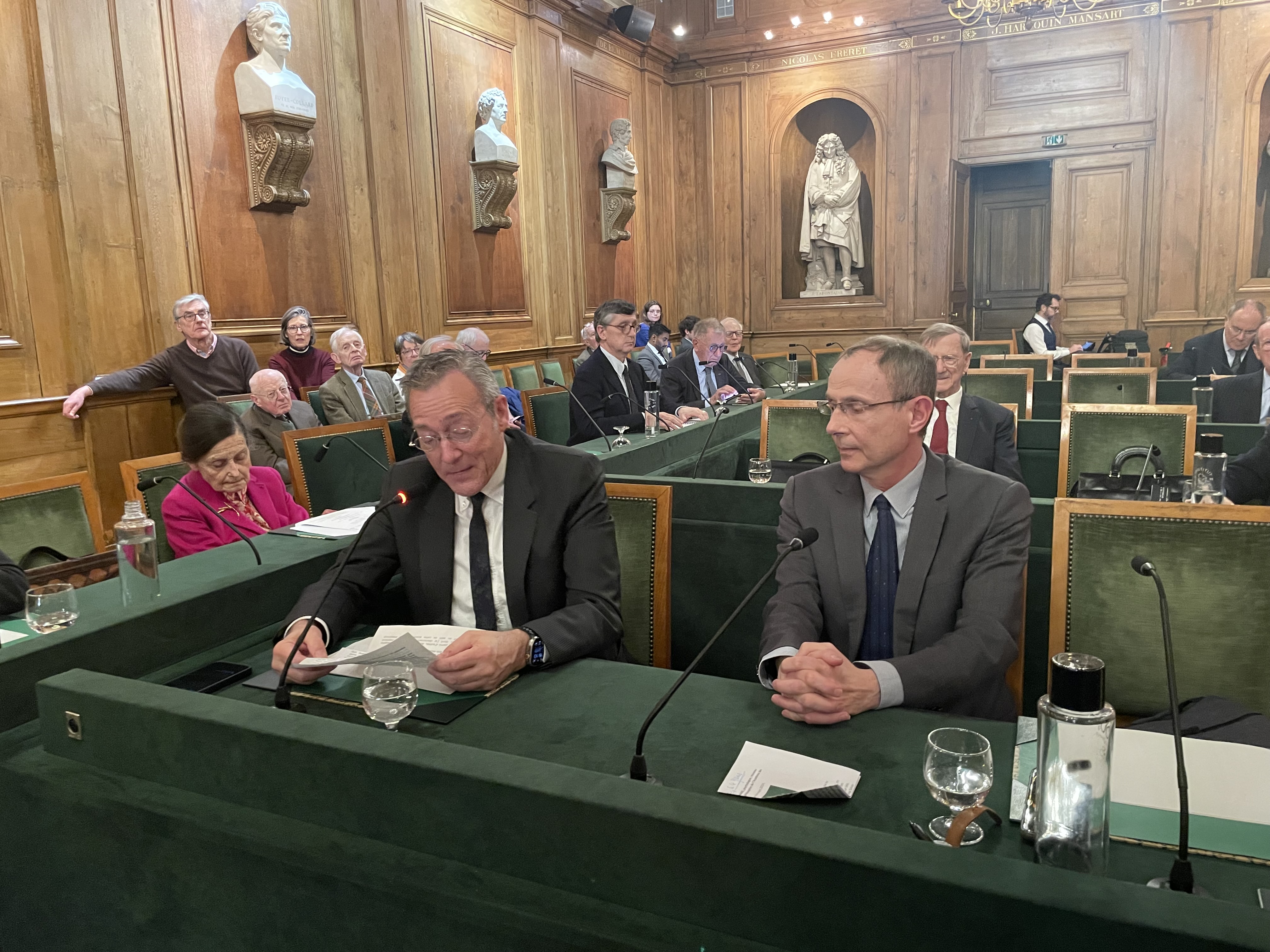 La séance, qui a réuni une quarantaine de personnes parmi lesquels plusieurs membres de l’Académie, s’est déroulée en présence de Bernard Stirn, Secrétaire perpétuel de l’Académie, et de Pascal Ory, membre de l’Académie française et directeur scientifique de France Mémoire.
