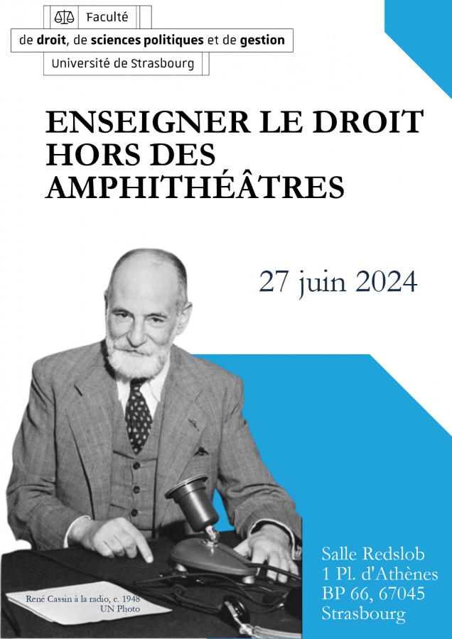 Faculté de droit de Strasbourg Faculté de droit, Salle Redslob, 1 place d'Athènes, Strasbourg, Franceà l'Université de Strasbourg (sur inscription) - détails en bas de page Présentation La forme de l'enseignement en amphithéâtre, pourtant presque millénaire, s'est maintenue malgré de nombreuses transformations de l'enseignement du droit. La technique offre cependant, depuis longtemps et de plus en plus, des modalités alternatives dont les effets pédagogiques et scientifiques doivent être évalués.